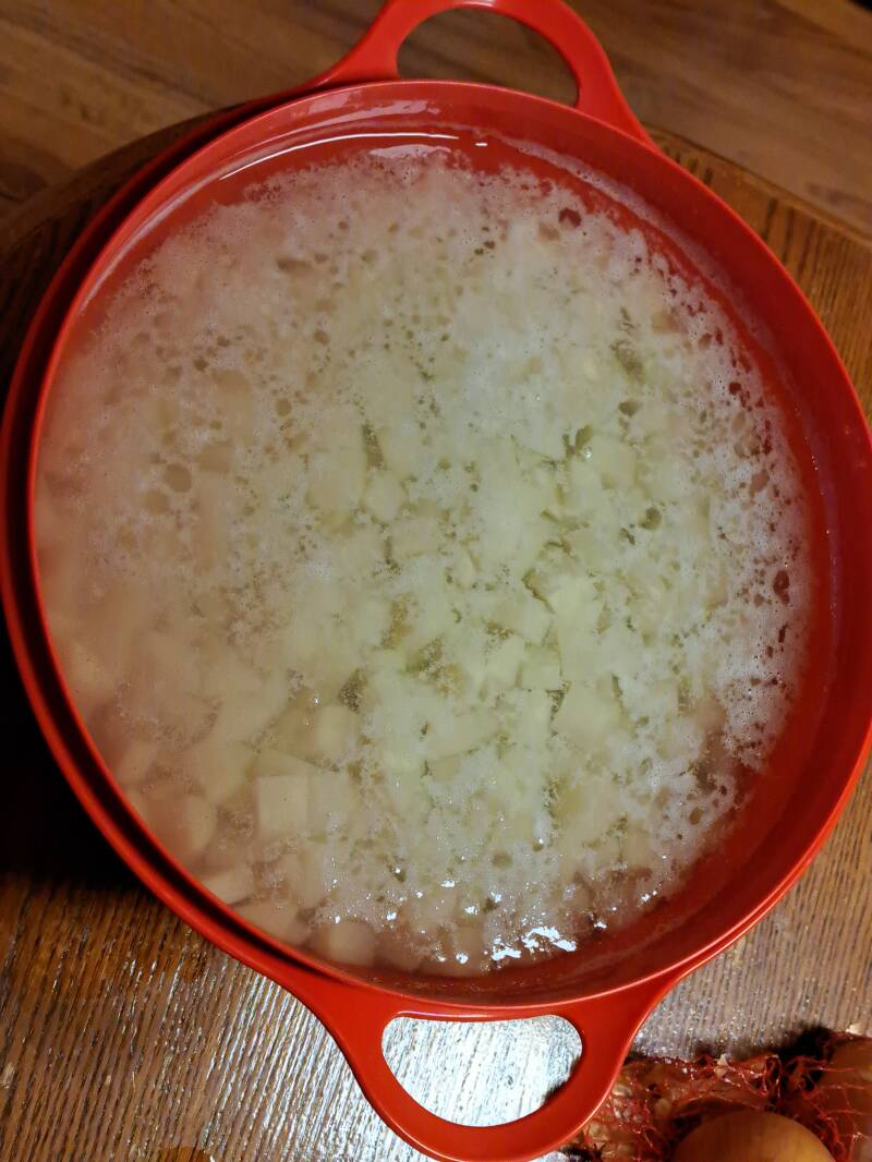 Allow the potatoes to soak in the water while you prepare your work space for the next step.